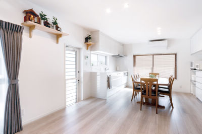 愛着あるダイニングテーブルを中央に配置。キッチン、カップボードは新しくしながらも以前と同じレイアウトで使い勝手のよさはそのままに。