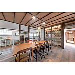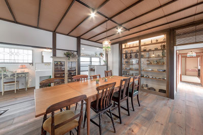リフォーム前の趣を残し、ご親族が集まって食事ができる大きなテーブルがあるダイニング。アンティークのステンドグラスや白タイルの造作洗面台、御祖父母様の骨董品に囲まれた落ち着きのある空間です。