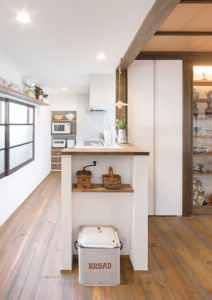 キッチンはリビングからの視線を遮るカウンター付きの棚を設置しました。
