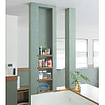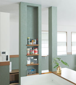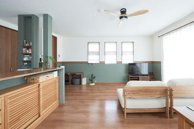 グリーンの壁紙とチェリー色の幕板で仕上げた腰壁で、あたたかみのあるリビング・ダイニングに。キッチン横の袖壁も同じ壁紙で仕立て直し、統一感を持たせました。