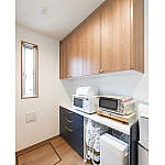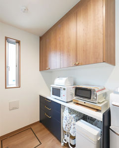 キッチン背面の吊り戸棚は、LDKに馴染むチェリー色に。その下には、ごみ箱を収納するスペースを確保して引き出し収納も設置。