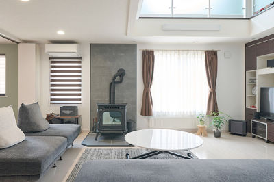 存在感のあるペレットストーブはリビングの主役。火を入れていなくてもインテリアとして空間にあたたかみを与えています。