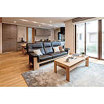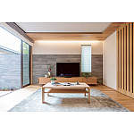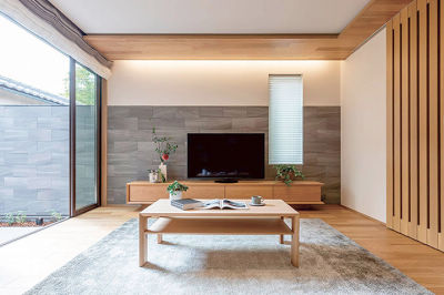 テレビの後ろの壁とテラスの壁は同じ石目調の壁材を採用。室内と屋外のつながりが生まれ、より開放感あふれる空間に。