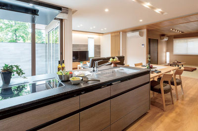 テラスの景色に癒されながら作業ができるオープンキッチン。ダイニングテーブルをキッチン横に配置し、配膳や後片付けをラクに。