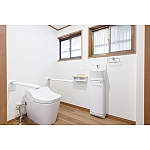 洋式トイレ・小便器のスペースはひとつにして、車いすでも入れる広さを確保。トイレ内に手洗いを設置してご両親の寝室側にも出入口を増やすことで、動線を改善しました。