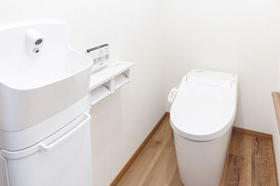 もうひとつの和式トイレも、省スペースで設置できるタンクレスの洋式トイレに新調。床は廊下と合わせてフローリングに変えて、段差を解消しました。