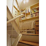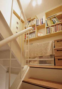 賃貸マンションの時は共用部分だった階段ホールには収納棚を設置してスペースを有効活用しました