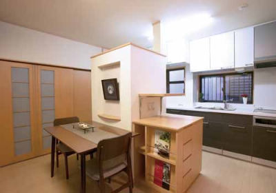 家事を時間差で行うことが多い二人姉妹のI様は、IHクッキングヒーターの魅力を展示会で実感しリフォームを決意。採用されたのは構造上抜けない柱を利用し、冷蔵庫を囲む「隠し壁」とアイランドカウンターを設けた回遊性の高いプラン。どちらかがキッチンで調理をしながら、一方はダイニングで食事をしたりくつろいだりと、ほど良い距離感を保ちながらコミュニケーションできる空間になりました。
