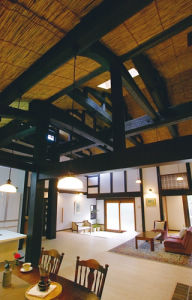 ダイニングから見た玄関側。2階および天井を取り去って現した建築当初の梁組みが、ダイナミックに当時の面影を伝えています。