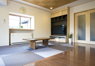 リビングには畳コーナーを設けお孫さんが昼寝をするのに格好の場所に。お祖母様の居室はトイレとダイニングの間に配置し、家族がいつも見守られるようにしました。水回りもゆったりとしたバリアフリー設計で、四世帯が快適に暮らせる住まいが完成しました。