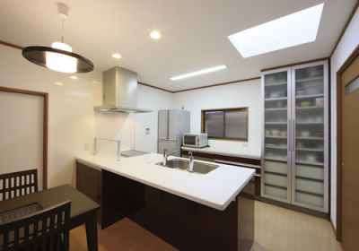 LDKと水まわりの位置を入れ替え、家族が集いやすいようLDKを家の中心に。南北に長い20畳の大空間には、南側に大きな窓を、北側のキッチンの上に天窓を設け、光に満ちた明るい空間を実現されました。限られたスペースで二世帯分の収納量を確保するため、各部屋はもちろん小屋裏までも収納として活用。お母様と3人が仲良く快適に過ごせる、共有型二世帯住宅が完成しました。