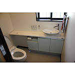 広々としたトイレ。手洗いカウンターにはペーパーや