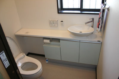 広々としたトイレ。手洗いカウンターにはペーパーや洗剤のストック、お掃除道具もしっかり収納できます。