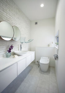 広いカウンターは洗面化粧台として使え、下部には掃除道具、タオルなどを収納可能。