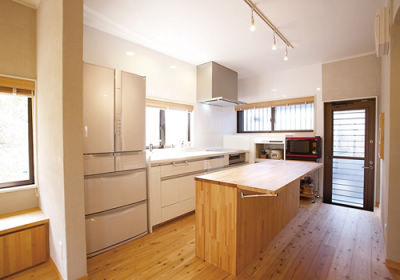 かねてより健康に配慮した住まいをと考えていたH様ご夫妻。定年後の生活を充実させるため、1階部分を全面リフォームされました。和室を撤去して生まれた広いLDKには自然素材を用い、床にはカラマツの無垢材を、調湿効果を期待して壁はシラス塗りで、天井には土佐和紙を採用。自然感いっぱいの木の香りが漂うここちよい空間となりました。たっぷりの収納を設けた寝室は1階のリビングの隣に移し、トイレへの動線も短縮。引戸を開ければベッドからリビングのテレビが見られる、使い勝手のよい仕掛けになっています。