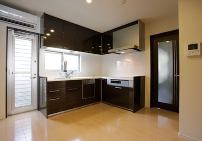 作業動線が短く効率的なL型キッチン。大きな採光部のドアを採用し、開放感のある空間を演出