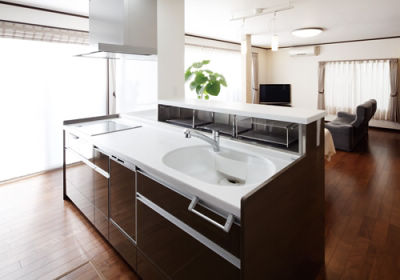 ハイステップ対面キッチンは、手元が隠せるから急な来客時も安心。水切り収納付きで洗い物もラクラク