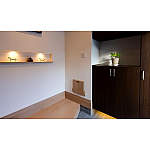 玄関の腰掛けスペースは、靴の脱ぎ履きや荷物置きなど用途はいろいろ。