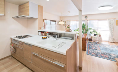 そこで「とにかく何とかしたかった」というキッチンを中心に、ご夫婦のこれからの暮らしを視野に入れたリフォームを行いました。間仕切りの壁を取り払い対面式としたキッチンは、ダイニング側にも収納を設けるなど収納容量を確保してすっきり片付きます。リビングと一体化したことで、明るいLDKになりました。水廻り設備も一新、手すりや引き戸など、安心して暮らせる設備を取り入れたこともポイントです。