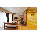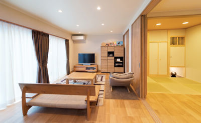 かねてからお使いの無垢材の家具に合わせ、室内は自然のぬくもりを感じるあたたかみのある空間に。ウッドデッキ敷の中庭を中心にしてLDKの採光を確保。ご両親想いのS様のご希望でしつらえた仏間と一体化した、広々LDKになりました。