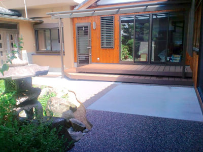 LDKから外へのつながりを考え、一体感を出すためのデッキ。アプローチは樹脂洗い出しとコンクリート金ゴテ押さえ。