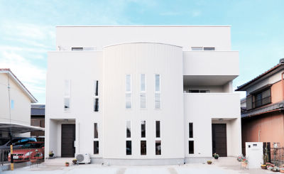 限られた面積を有効に活かすため、3階建てのテクノストラクチャー工法を採用。正面の外壁は印象的なR壁設計に。1階のお施主様世帯のフロアは、テクノストラクチャーならではの約26帖の大空間LDKが実現しました。赤のキッチンがピアノの色とマッチし、見た目にも美しいハーモニーを生んでいます。上質感のあるギャラリースペースはひときわ目を引き、多趣味なT様にふさわしい仕上がりに。「親しい友人を集めてミニコンサートを開くのが夢だったんです」と、理想のライフスタイルにぐっと近づけたご様子でした。