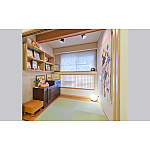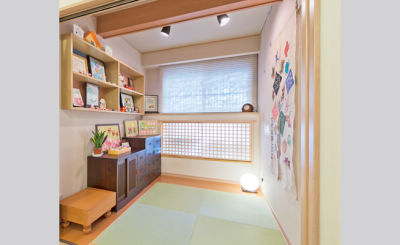 いちばんの特長となるのは、商店街に面して設計された趣味のお部屋。琉球畳をあしらった和モダンな空間には、折り紙が趣味だという奥様が、ご自身の作品を飾れる飾り棚を設けました。お部屋の外にも、作品をディスプレイできるショーウインドウを設置。色とりどりの折り紙に彩られた華やかな表情の住まいが生まれました。また、壁面収納や掘りごたつを採用したリビング、収納力抜群のシステムキッチンなど、暮らしの中心となる空間の使い心地も一新。趣味を活かす空間と、住まいの機能性が両立した住まいにK様も「毎日が楽しい」とご満悦のご様子です。