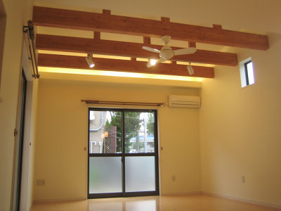 2階建を平屋に減築し、その分、天井を斜めに高く取りました。やわらかい間接照明を設置し、梁を出すことにより木の良さを活かしたおしゃれな空間にしました。