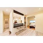 そのキッチンとなったのは、かつて納戸だった場所。収納が少なく、デッドスペースが多かったその場所にすっぽりと収まるよう、キッチンを新設しました。さらに、ダイニングはナチュラルな印象のアーチ状にし、リビングやキッチンから視覚的に独立した空間に。キッチンから直線でつながる勝手口の手前には、食品庫として重宝するパントリーを設けています。