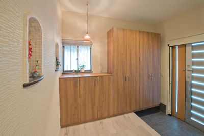 壁一面を利用した大容量の玄関収納ですっきり。