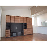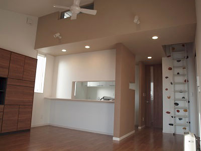 LDKは増築部分になるので勾配天井にして広く感じるようにしました。キュビオスにはパソコン台を組込み書籍・小物・オーディオ機器などすっきりと収納。ロフトに繋がる階段にはキッズ用ボルダリングを設置し、子供たちも大喜び。