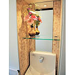 サイドの壁は水はね対策としてタイル柄のパナソニックキッチンボードを貼り可愛らしくしました。ガラスの飾り棚でインテリアも楽しめます。