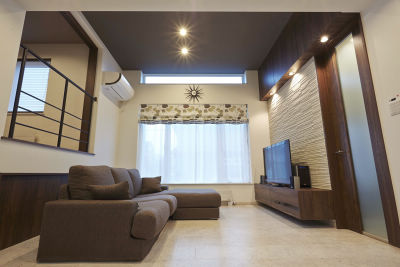 ご家族が増えて玄関やLDKも手狭になり、何かとお困りだったM様。そんなお悩みをすべて解決できるよう、1階は部屋数を変えずに、リビングの天井高を90センチ高くした「プチ吹き抜け」を採用。屋根や壁、基礎を外断熱にすることで小屋裏空間を減らし、その分、縦に広い伸びやかな家族の共用空間が生まれました。