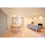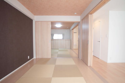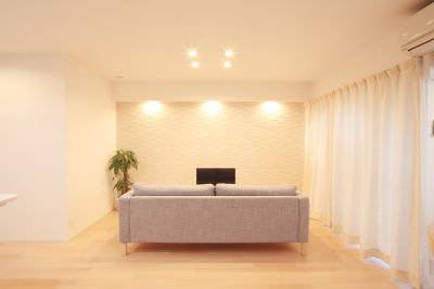 お子様の誕生をきっかけに、中古マンションを購入しリフォームを決意されたT様。2戸がバルコニー側でつながった間取りは、細かく間仕切られ閉塞感があったため全面的に見直してプランニング。和室の1つは間仕切りも撤去し、バルコニーに面したワイドなリビング・ダイニングに変身。壁付けで孤立していたキッチンも対面式とし、リビングで遊ぶお子様を常に見守れる位置に移動しました。「仕事から帰ってきて、手を洗ってリビングへ…という生活の一連の流れに合わせた間取りになっているので、すごく暮らしやすくなりましたね」とT様。空間にメリハリをつけるために採用したアクセントウォールの風合いやクロスの色合いも、奥様のお気に入り。ライフスタイルやご家族のコミュニケーションを考慮した空間に満足のご様子でした。