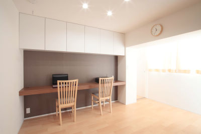 ワークスペースには、本棚を兼ねた吊り戸棚を設置。