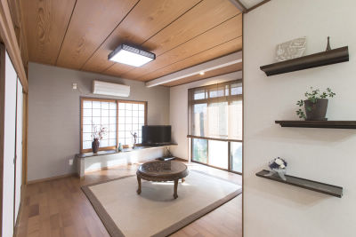 和の趣が落ち着くリビング。飾り棚がアクセントに。