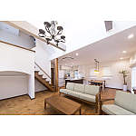奥様のご実家を譲り受けリフォームを計画されたK様。構造部分までかなり老朽化が進んでいたため、建替えをすることに。新しい住まいのテーマは、奥様ご希望の「フレンチハウス」。リビングには大きな吹き抜けを設け、2本の化粧梁と間接照明でさりげない上質感を演出。壁と天井は素朴な質感で、調湿機能にも優れた漆喰壁とし、吹き抜けの壁は陰影が美しいブリックタイルを採用しています。足元もボルドーパインの無垢フローリングと、自然素材をふんだんに盛り込んだ贅沢な空間に仕上げました。