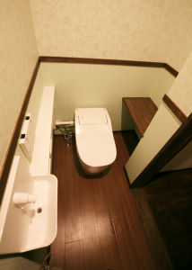 お手洗いは、収納スペースを確保しつつ、手入れをしやすいフラットフロアに。