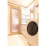 洗面化粧台・洗濯機を設置した洗面脱衣室ができました。サイドキャビネットや造作棚で収納スペースもしっかり確保。パネル仕様の扉で明るさにも配慮。
