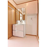 洗面所はかわいらしくピンクで統一し、お気に入りだった以前のミニキッチンの吊戸棚を再利用。