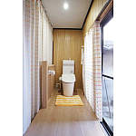 4畳の和室のうち1畳分を床上げして段差無しに。落下防止のための柵を施し、手洗い器付アラウーノVを設置。明るく開放的なトイレになりました。電気スイッチを付ける場所が窓上の垂れ壁しかなかったため、センサー付ダウンライトを採用。