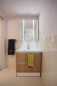 暗くて収納も少ない洗面所。タイルの目地掃除が面倒。
