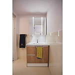 明るく快適な洗面所。腰までのパネルで表情も豊かに。