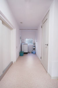 数十年前に増築した離れ(コンクリート造)の中にある浴室・洗面・洗濯室。暗く・寒く・段差がたくさんあるという現状でした。段差の解消や浴室暖房乾燥機の設置・壁を明るく(薄いピンク)にすることにより、広々として明るい空間を実現することができました。段差の解消のため、LDKと洗濯室の間の扉はH1700と低めになっておりますが、今までは下ばかり気にして歩いていたところを、上を向いて歩くことができると、人生における姿勢を変えることに喜びを感じてくださいました。