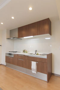 LDKを広く使用するため、壁付けのI型キッチンをご採用。