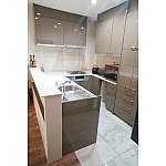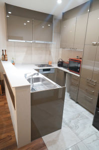 収納の扉を鏡面仕上げにした事で高級感のあるキッチンへと変身しました。