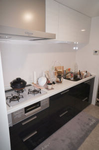 キッチン、水廻り、内装のリフォーム。 キッチン等の水廻りはシックな色目を使う事で落ち着いた雰囲気に変身。 また、約10帖に広くなった洋室には施主様ご希望のエコカラットを2面に張りワンランクUPした空間に仕上がりました。
