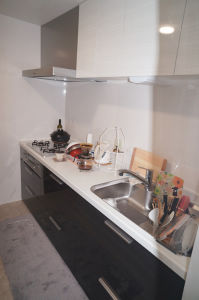 キッチン、水廻り、内装のリフォーム。 キッチン等の水廻りはシックな色目を使う事で落ち着いた雰囲気に変身。 また、約10帖に広くなった洋室には施主様ご希望のエコカラットを2面に張りワンランクUPした空間に仕上がりました。