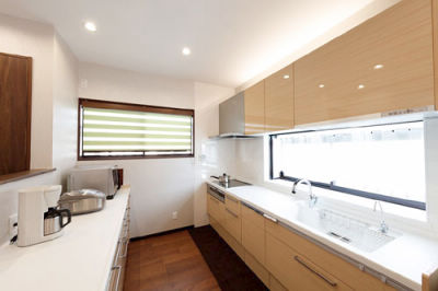 キッチンはラクシーナを採用。奥様の家事負担を軽減する、お掃除の楽なスキマレスシンクや10年間お掃除不要のほっとクリーンフード、食洗機等を搭載。