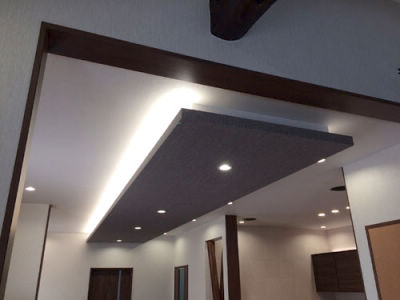リビングの天井は一部下がり天井に。ダウンライトと間接照明でシーンに合った明るさを楽しめる様工夫。